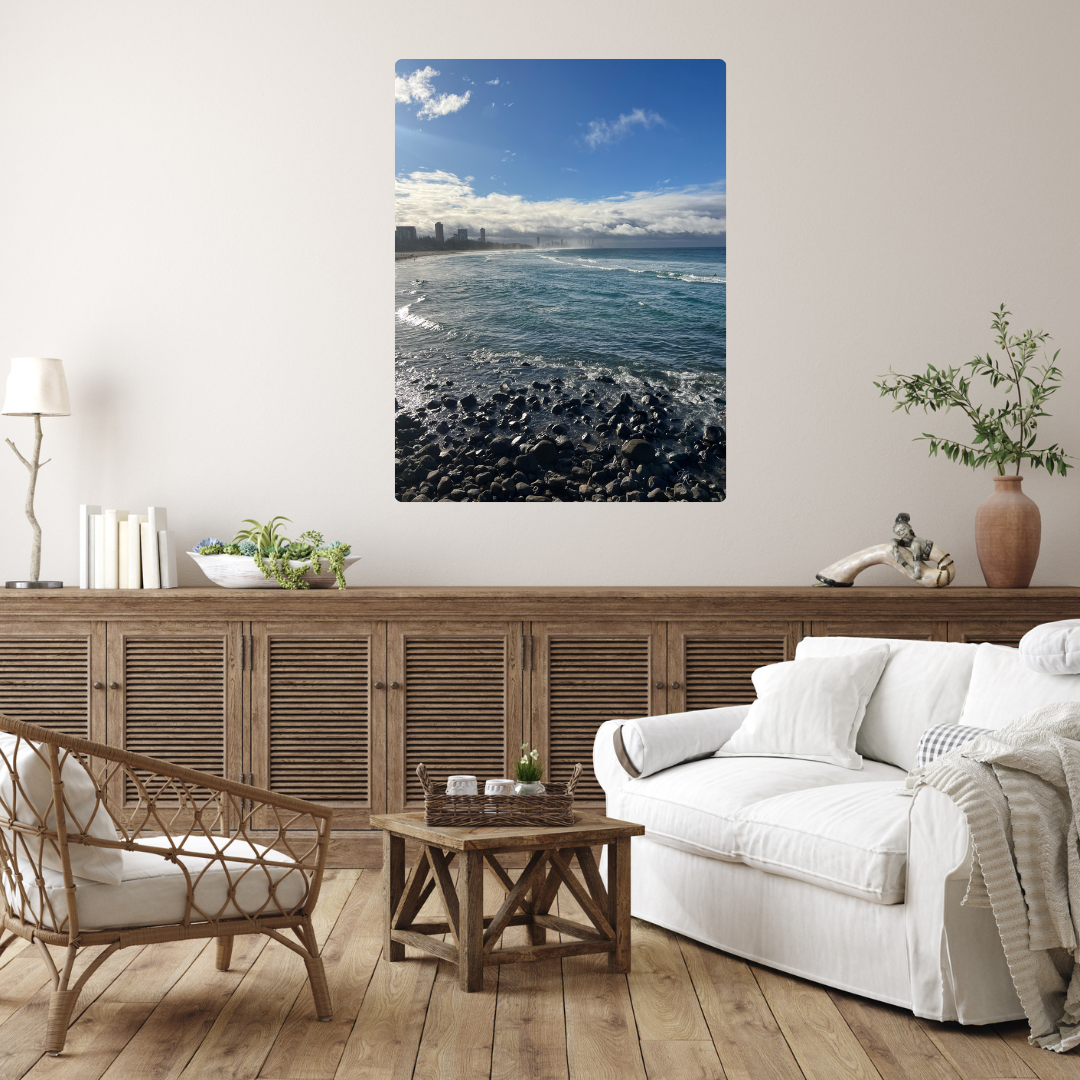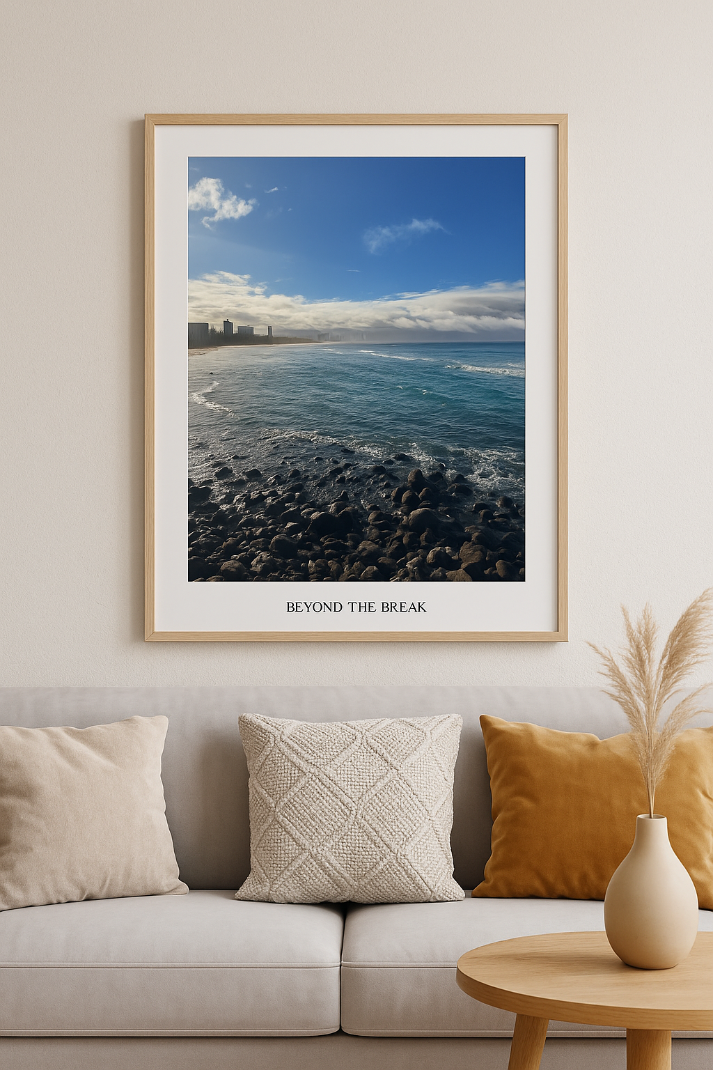 Beyond the Break captures a powerful coastal stillness just after impact — where the ocean meets volcanic stone, and the skyline dissolves into a veil of light.