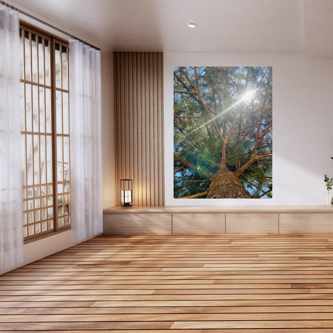 Photographed from the base of a towering pine, this piece captures a moment of pure elevation — where light filters through like a crown, resting on branches that have stood through seasons.