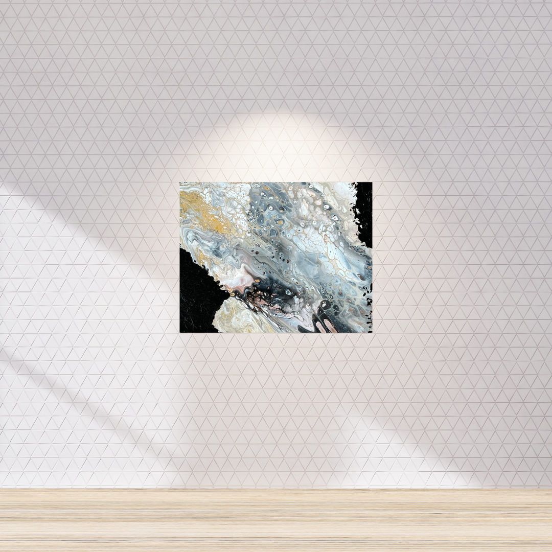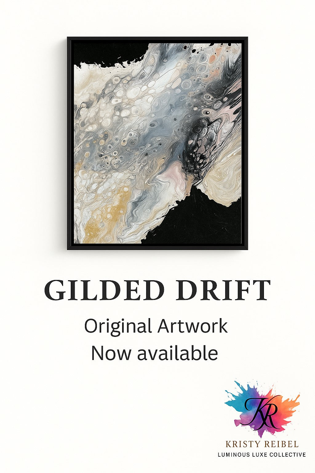 “Gilded Drift” evokes the silent beauty of nature’s most elegant moments — gold weaving softly through muted greys, soft whites, and delicate hints of black. Every glance reveals new depths, from rich textures to shimmering light play.