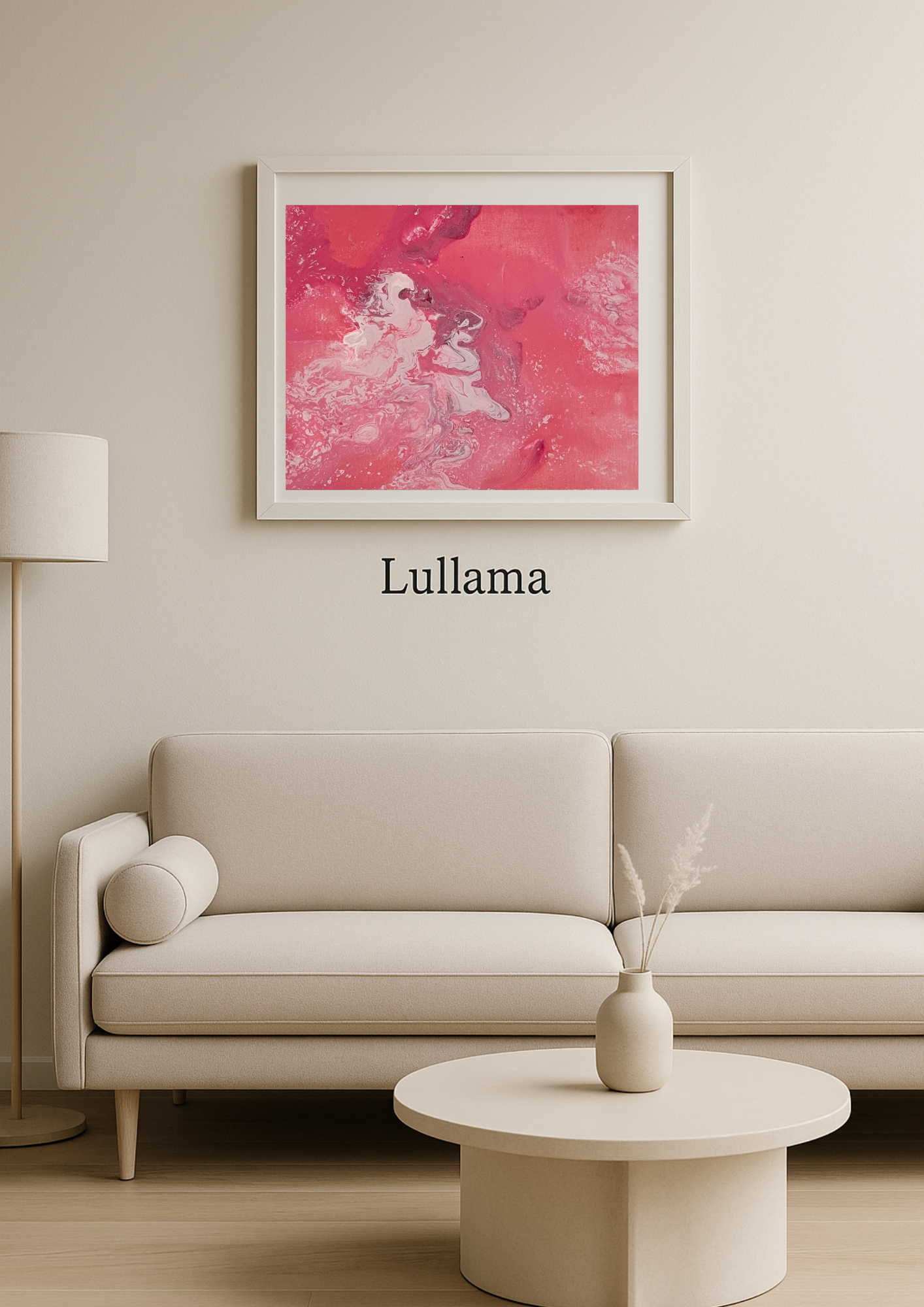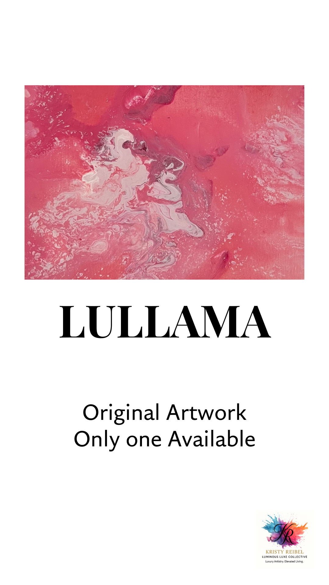 Lullama is a delicate and dreamy piece — layered in gentle pinks, whites, and soft flows of misty energy. At its center, a subtle figure appears — a llama-like form emerging from the swirling calm, like a spirit guide in a dream.