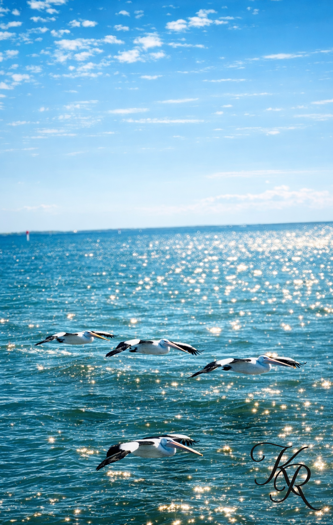 Wings cut cleanly through open sky, carried by light, movement effortless and assured. There is no urgency here — only direction. The horizon feels wide, the air expansive, the moment unbothered by anything below it.