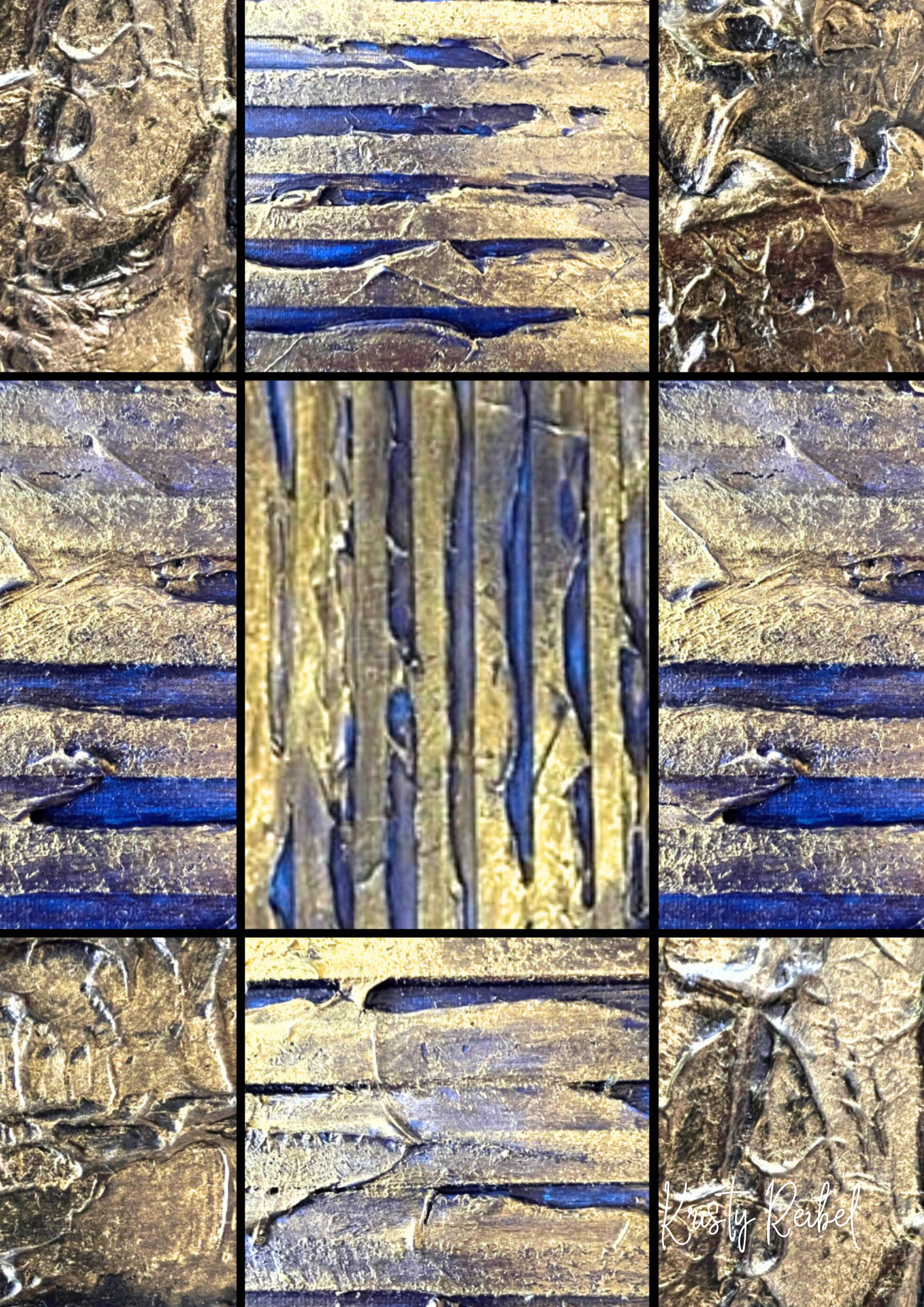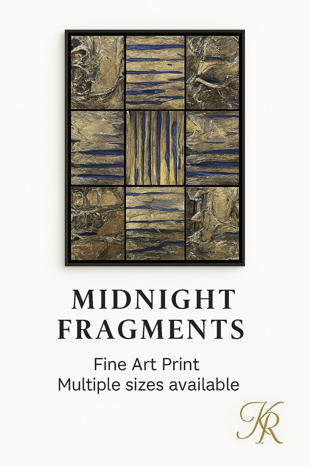 Midnight Fragments reimagines the original artwork Midnight Lineage through a collage of close-up textures. Every detail invites you to lean in — to explore the ridges, cracks, and layered strokes that echo the feeling of moonlight glancing off dark water.