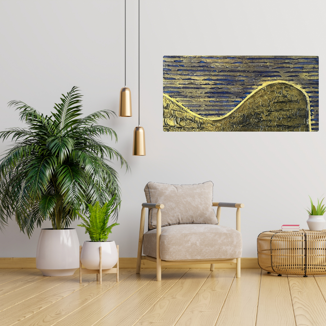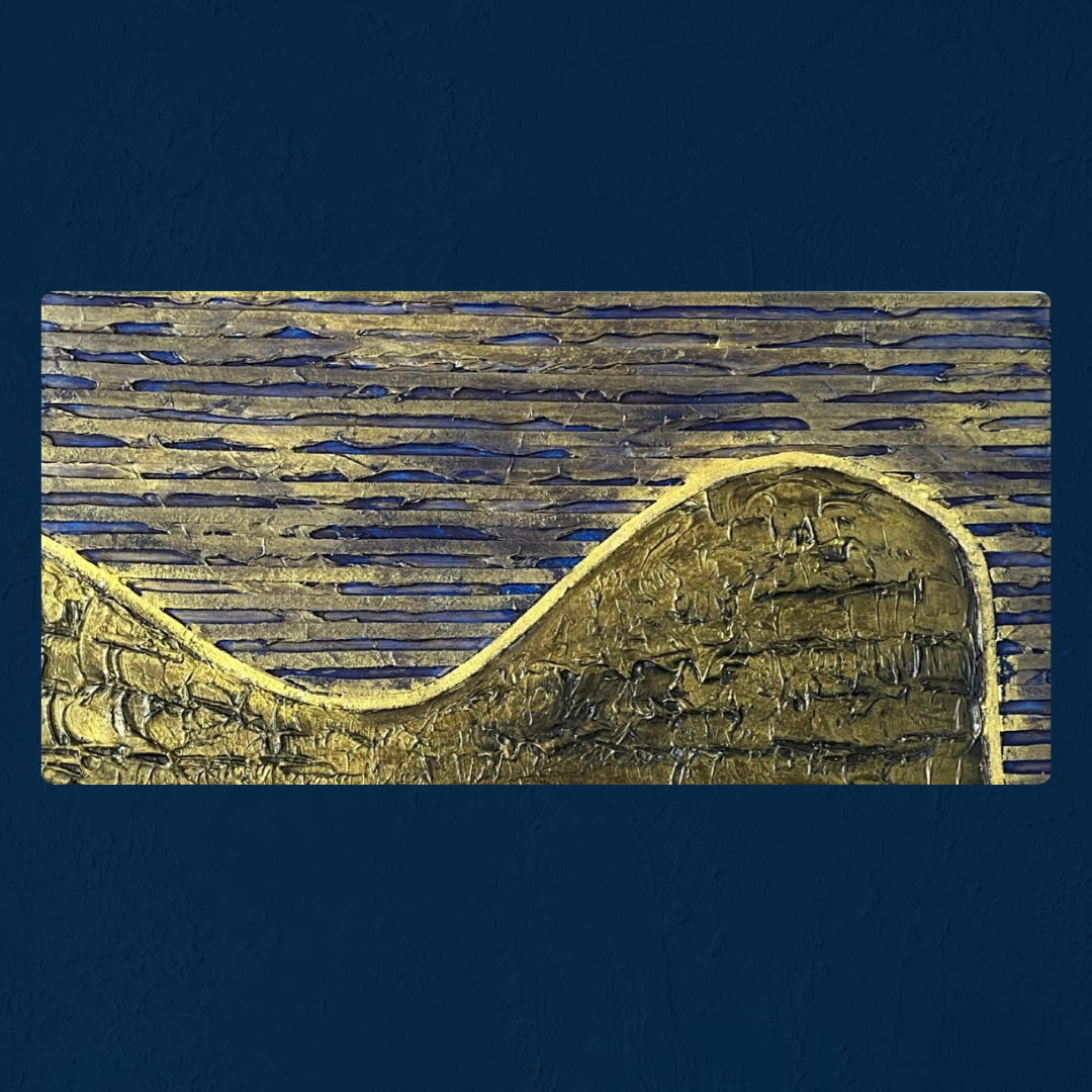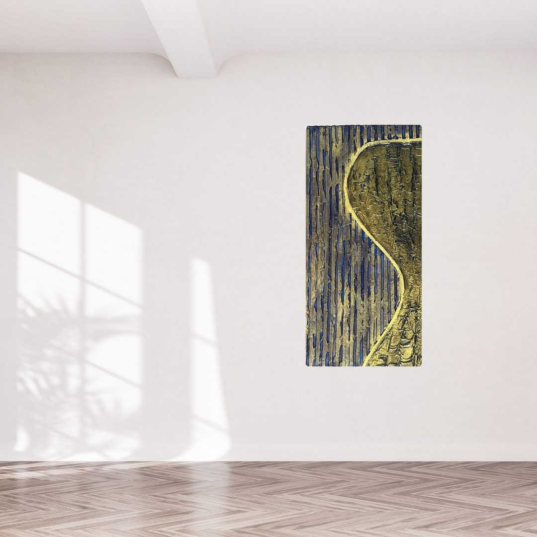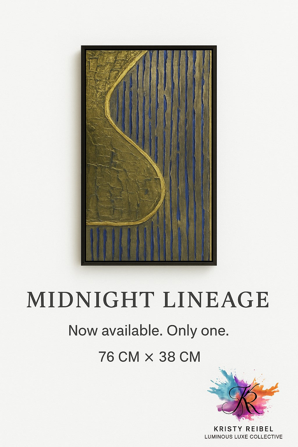 Like ancient markings carved into the night, Midnight Lineage weaves sculptural texture with rich midnight blues and molten gold. With every ridge and raised stroke, this piece feels like a memory etched across time — mysterious, architectural, and undeniably bold.