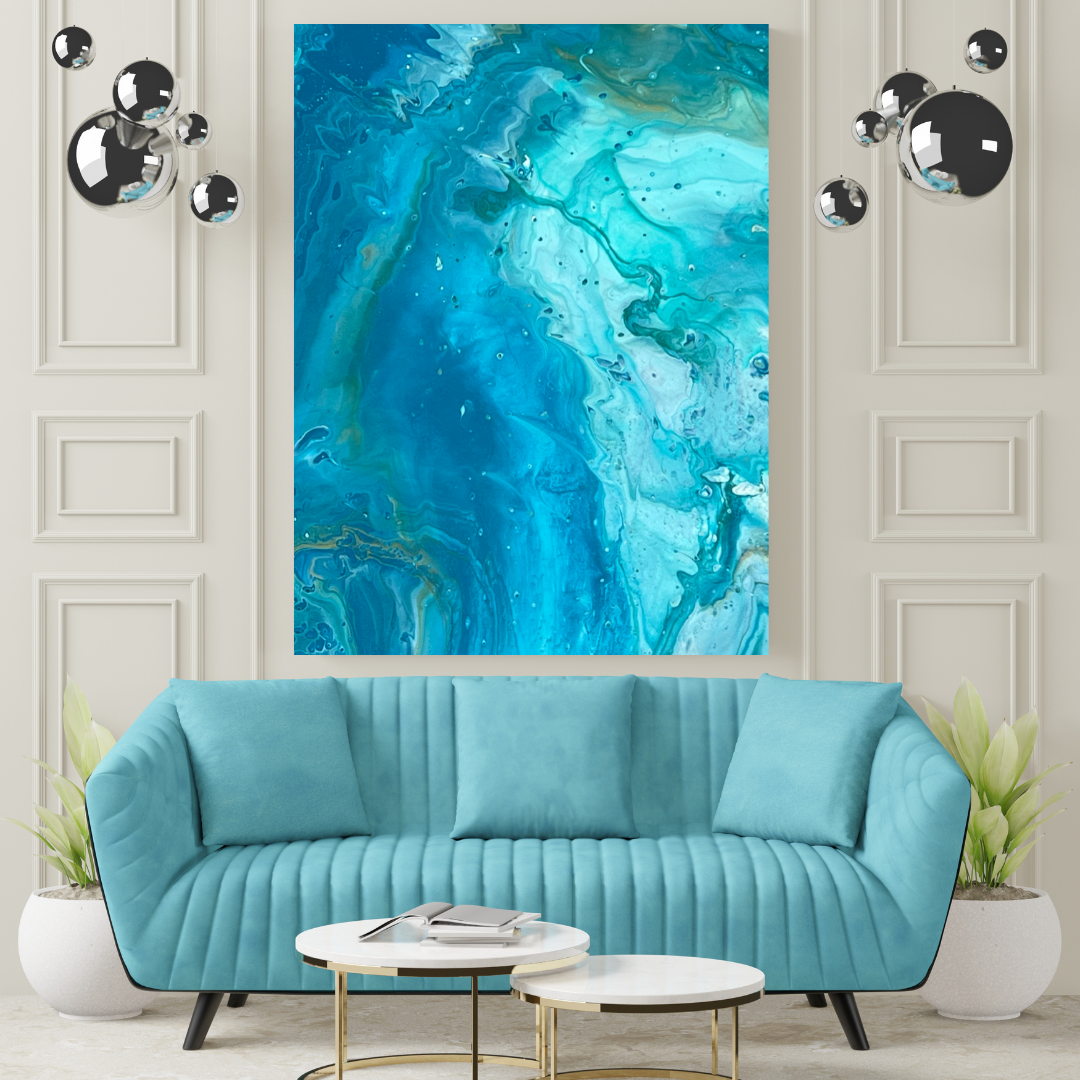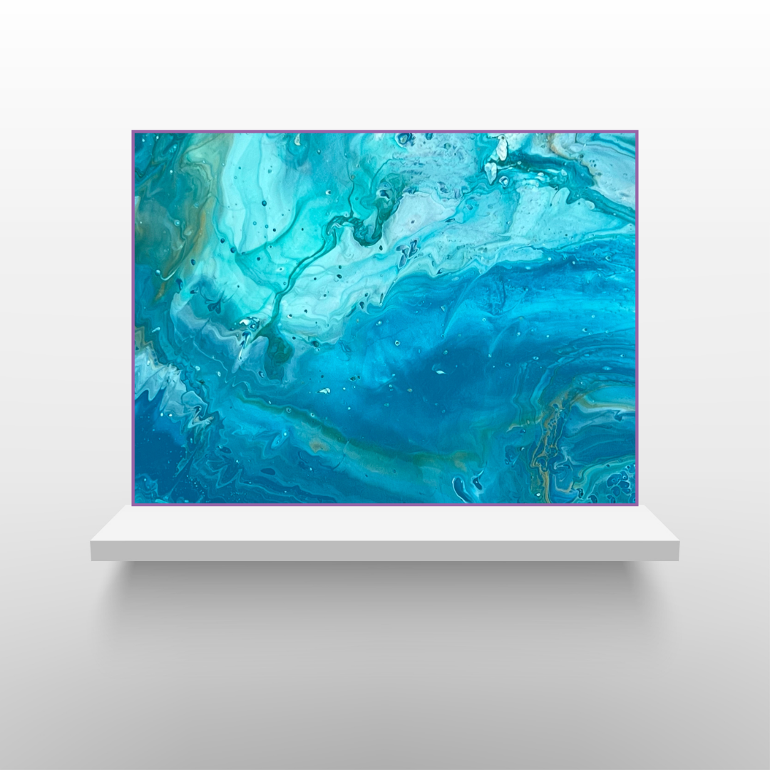 A symphony of deep turquoise, teal, and celestial whites, this piece evokes the sacred meeting between ocean currents and dreams. Every ripple, every fluid line carries the magic of nature’s eternal dance — a moment captured, a feeling immortalized.