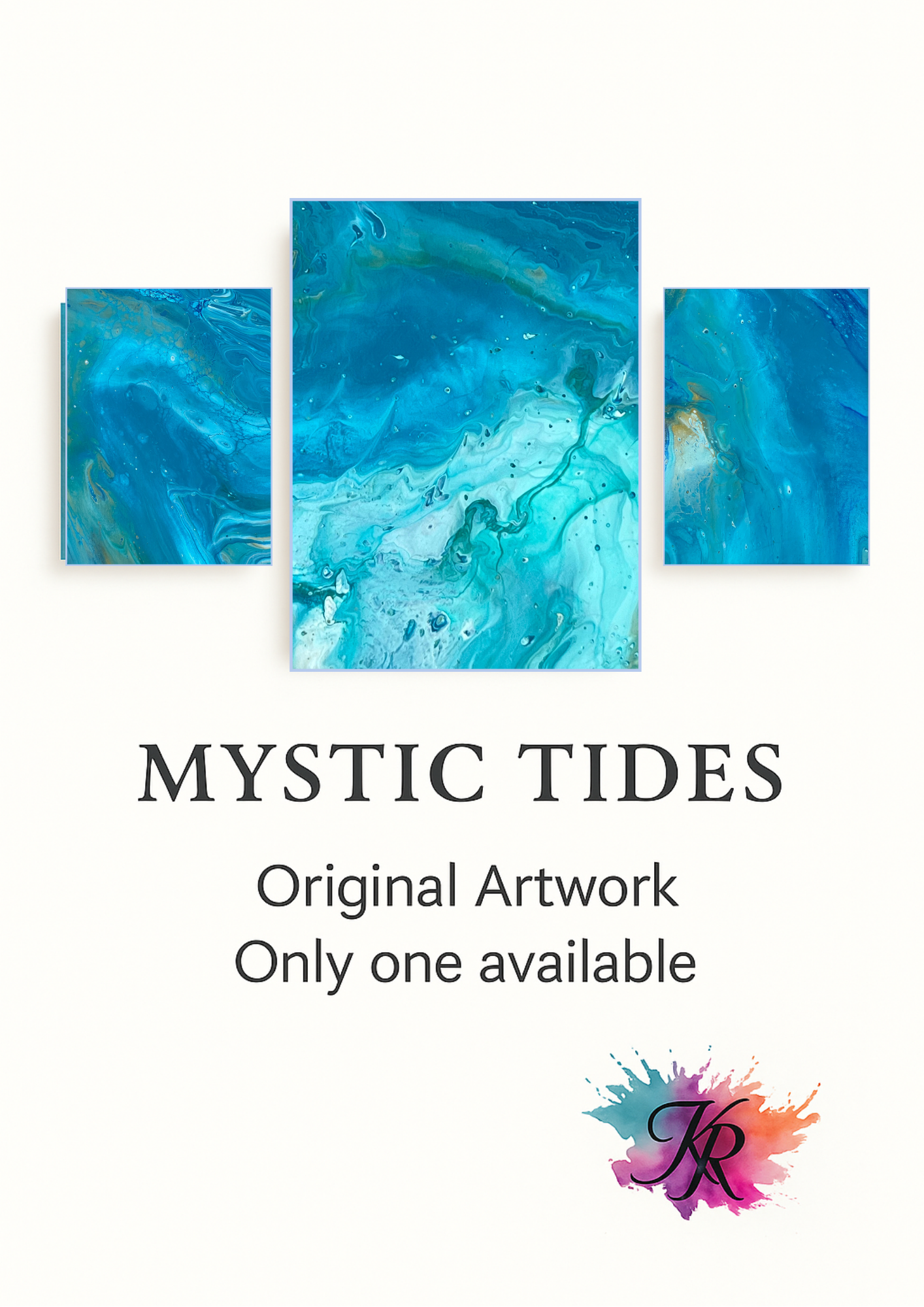 Mystic Tides captures the raw elegance of the sea — vibrant blues, shimmering light, and the timeless rhythm of the ocean’s heart.