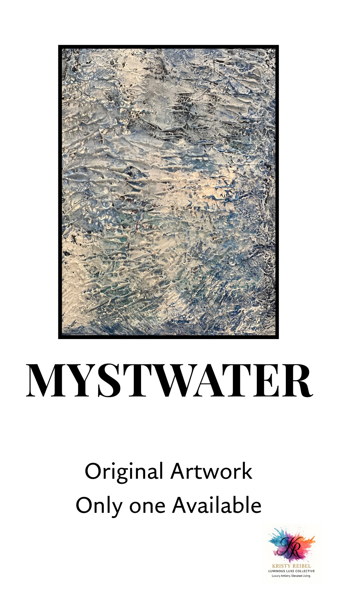 Mystwater is a richly textured original artwork inspired by the feeling of discovering a waterfall deep within a cave — the hush of droplets, the shimmer of light, and the powerful stillness that follows.