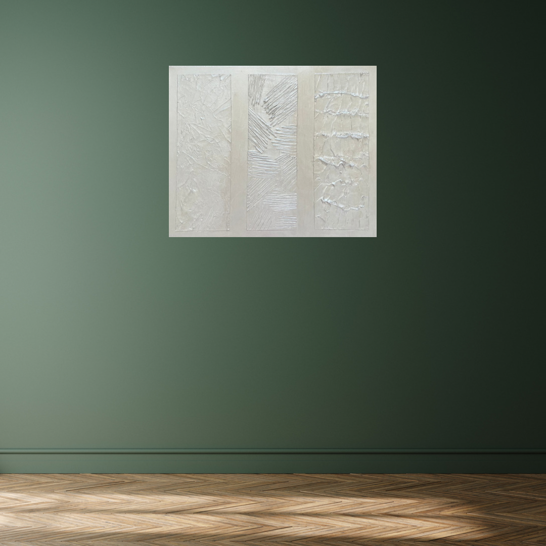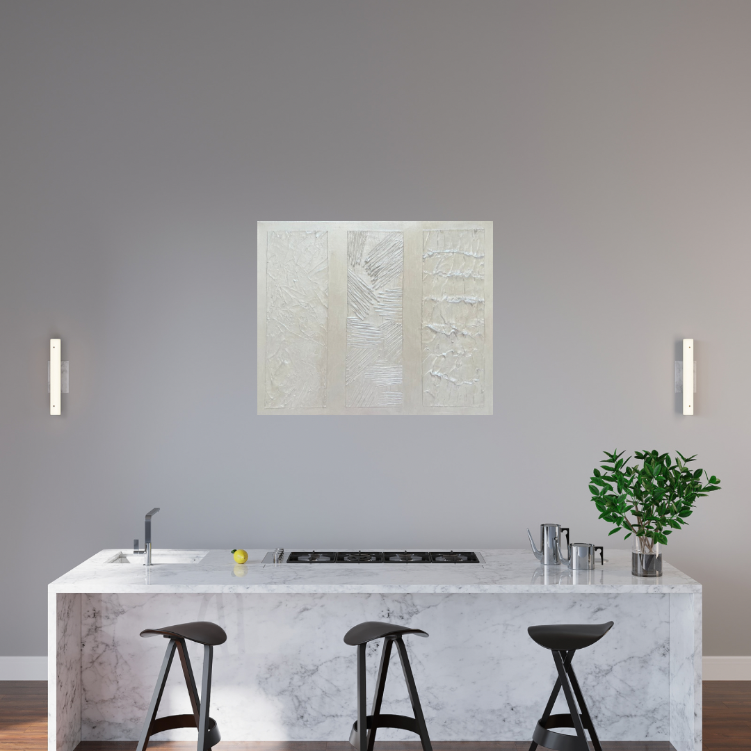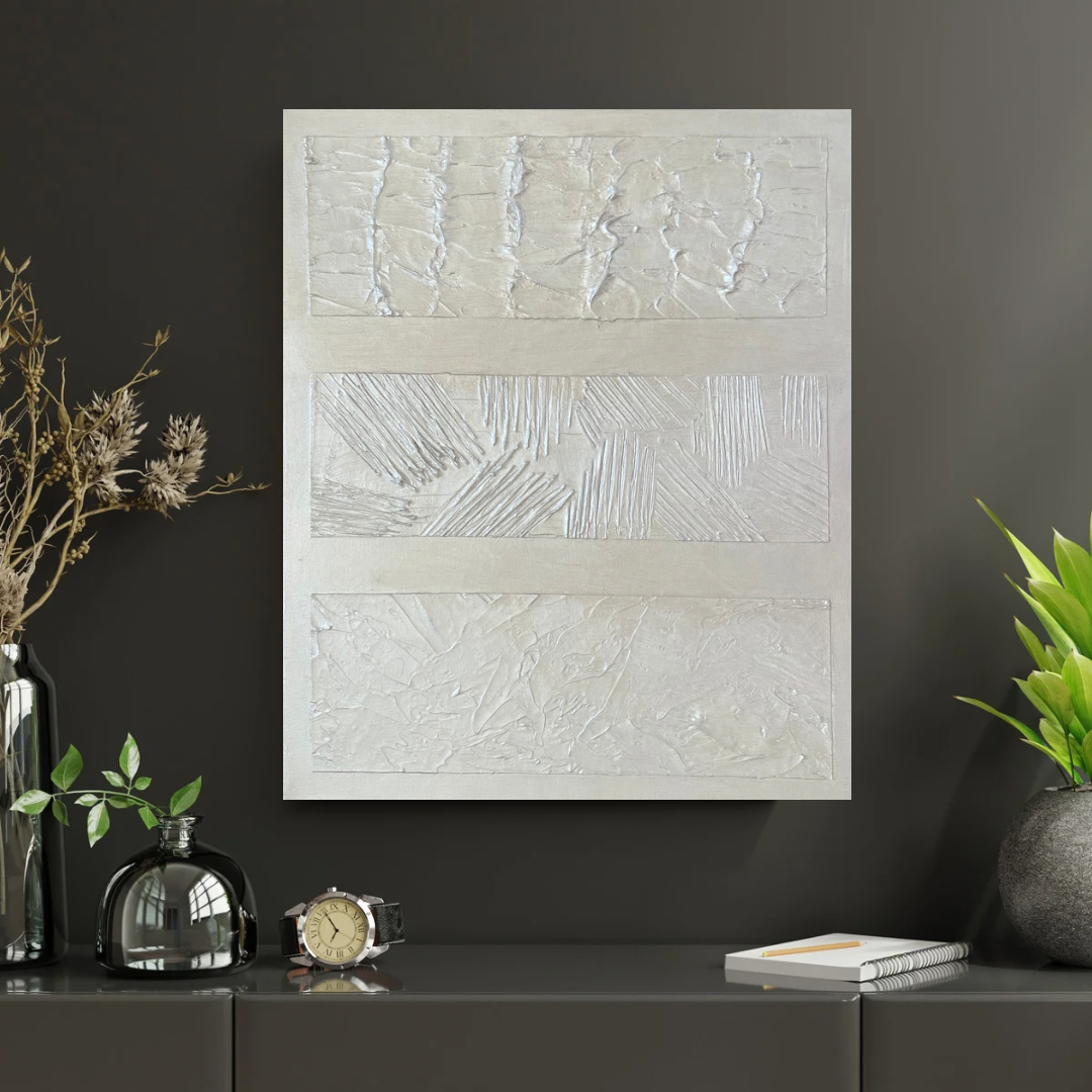 Elevate your space with the ethereal beauty of Divine Glam, a one-of-a-kind textured acrylic painting on canvas. This striking piece, painted in luminous Pearl White, captures the essence of elegance and sophistication. Layers of textures create a dynamic interplay of light and shadow, evoking a sense of depth and movement. The minimalist yet opulent design makes it a perfect statement piece for contemporary, modern or luxe interiors.