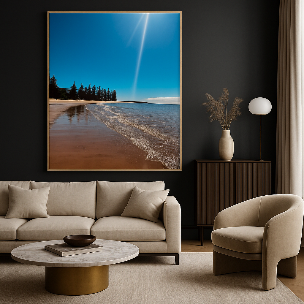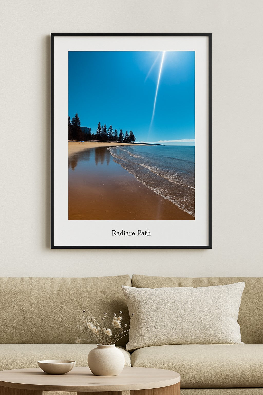Radiant Path is a breathtaking portrait of a perfect coastal morning — where the sun breaks through the sky in a single luminous beam, lighting the shoreline with effortless grace. Captured on a quiet beach walk, this piece evokes presence, purity, and possibility. It’s not just a view — it’s an energy shift.
