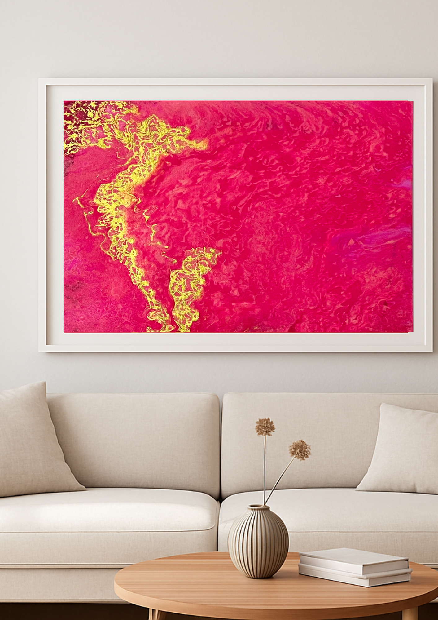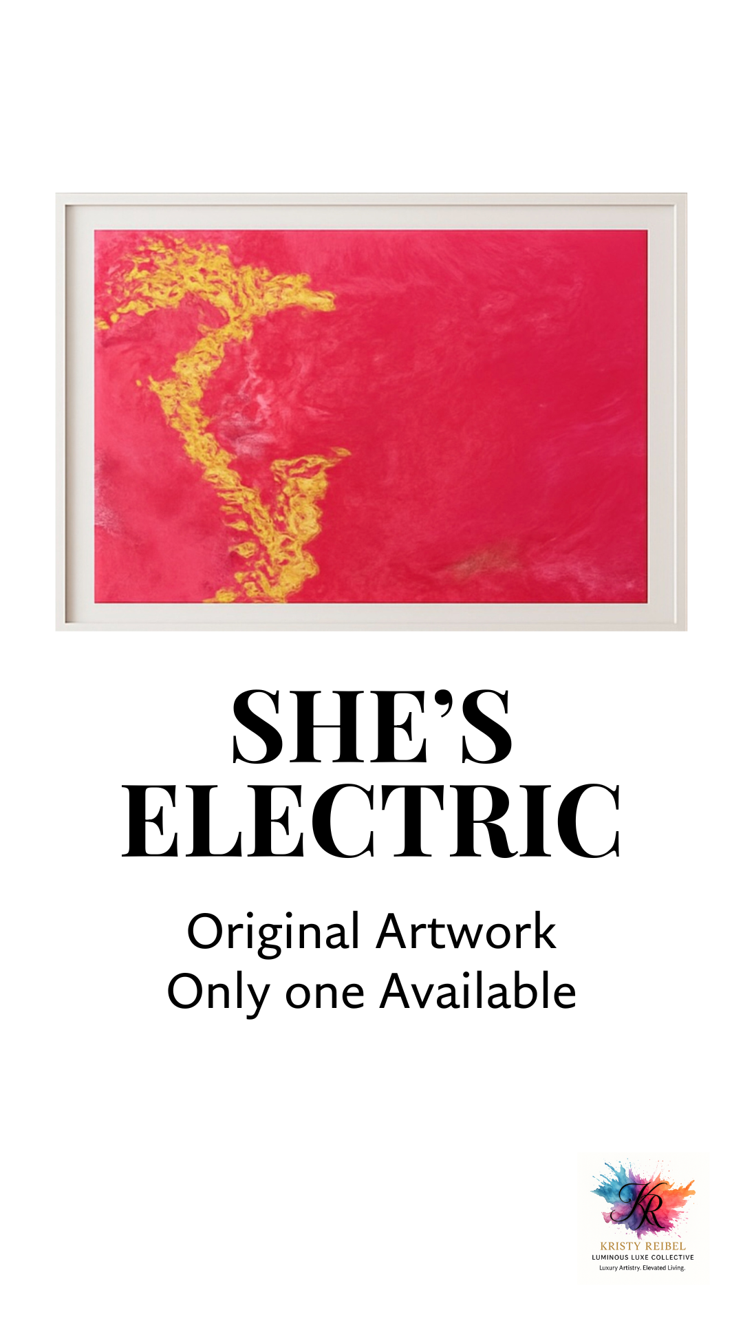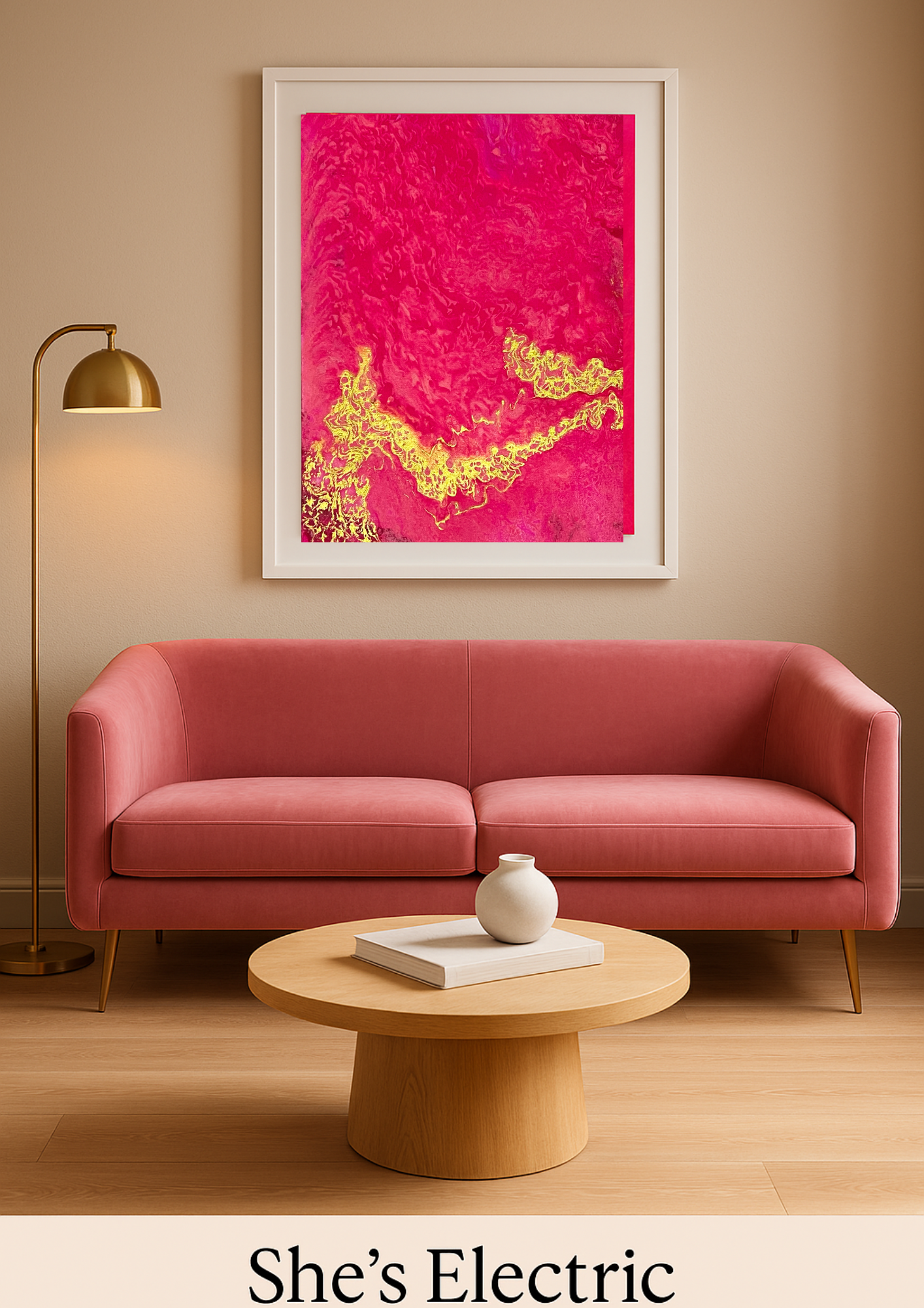 She’s Electric is a pure embodiment of feminine fire: a vibrant surge of fuchsia and electric gold wrapped in crisp white framing. Every inch of this piece pulses with high-vibe confidence and movement — a celebration of fierce softness and magnetic presence.