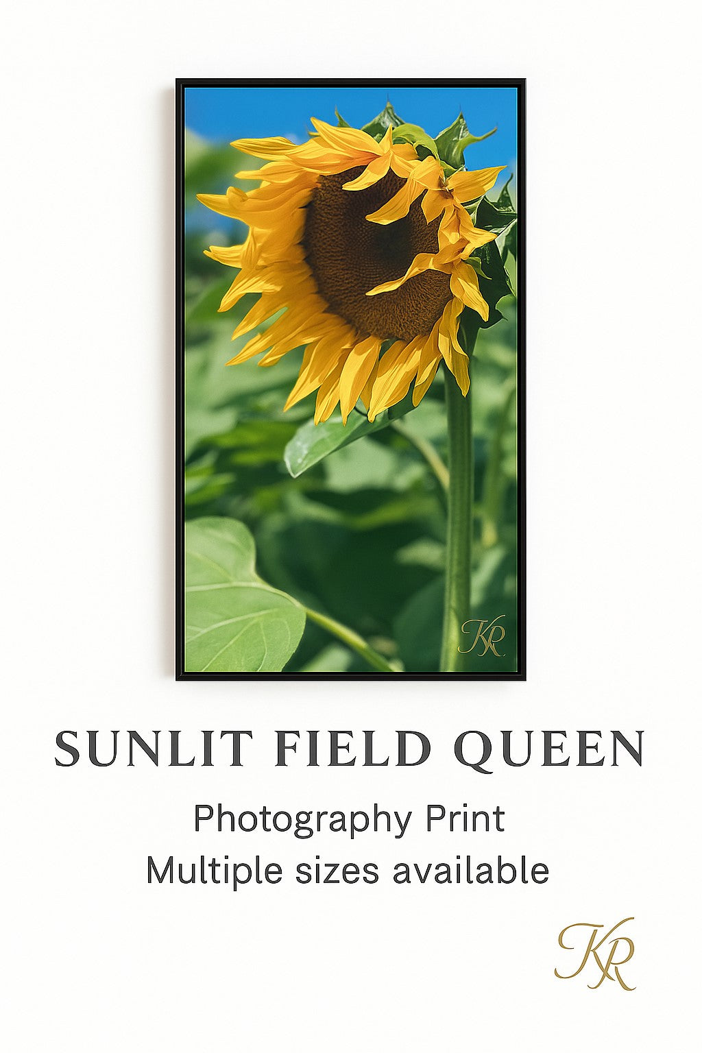 Sunlit Field Queen captures a sunflower in all her glory — basking in the light, towering tall with effortless grace. Framed by a clear blue sky and lush green foliage, this image celebrates the quiet power and golden beauty of nature in full bloom.