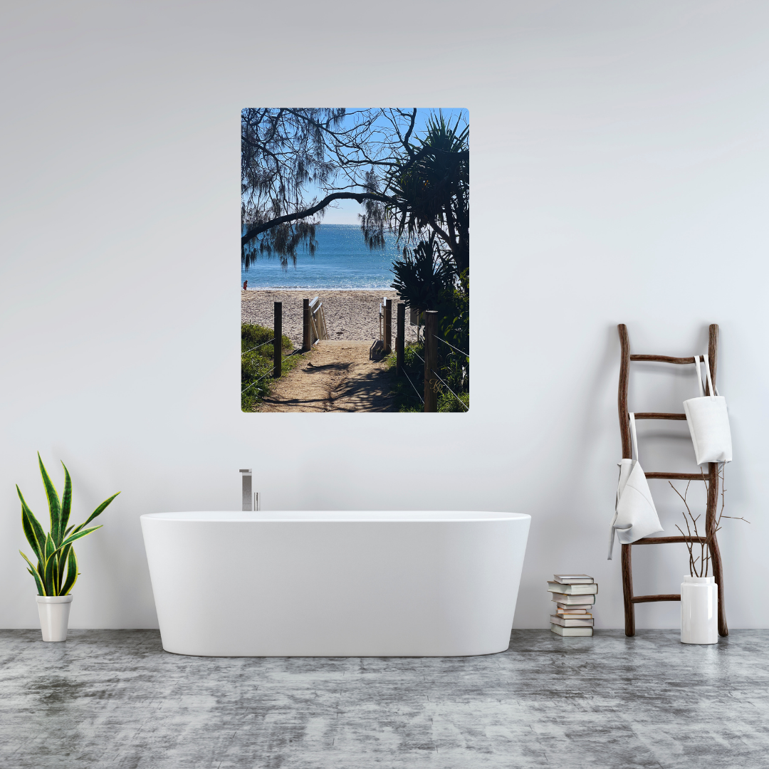 The Glistening Threshold captures the serene pause just before stepping onto the sand — a view framed by shadowed trees and soft coastal light. Taken from a beachside path, the photograph reveals a scene both grounding and expansive: sun-kissed ocean, golden shore, and a lone figure dissolving into the moment. This piece invites contemplation, calm, and the kind of beauty that doesn’t ask to be found — it simply is.
