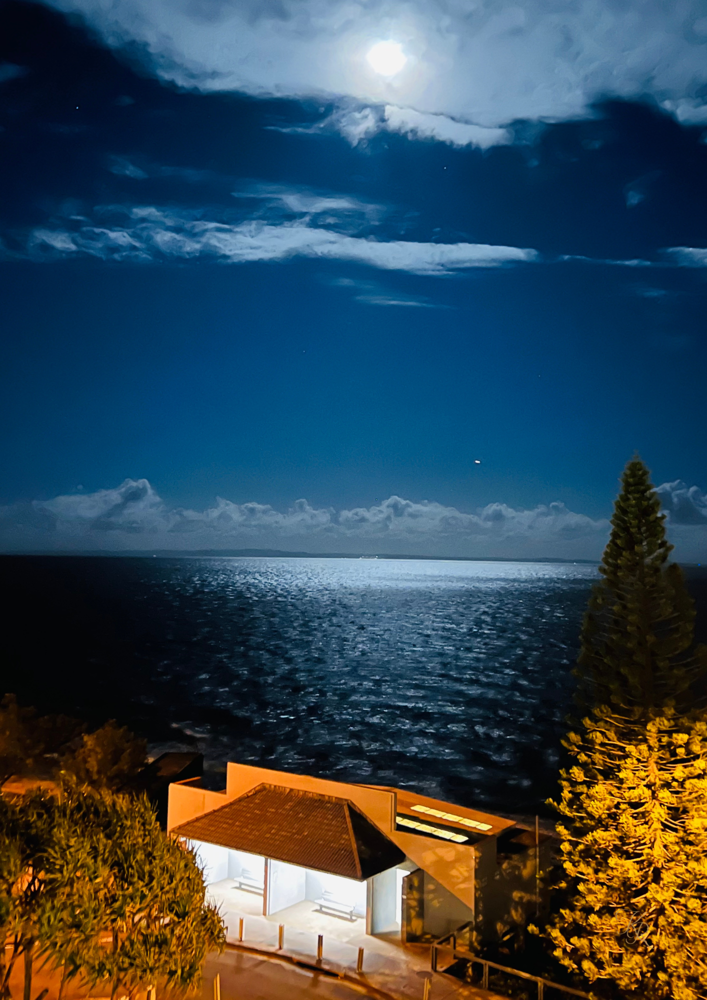 The moonlight spills across the ocean like liquid silver, illuminating everything in its path. The shadows don’t threaten — they frame the glow. This piece invites you to sink into that knowing: