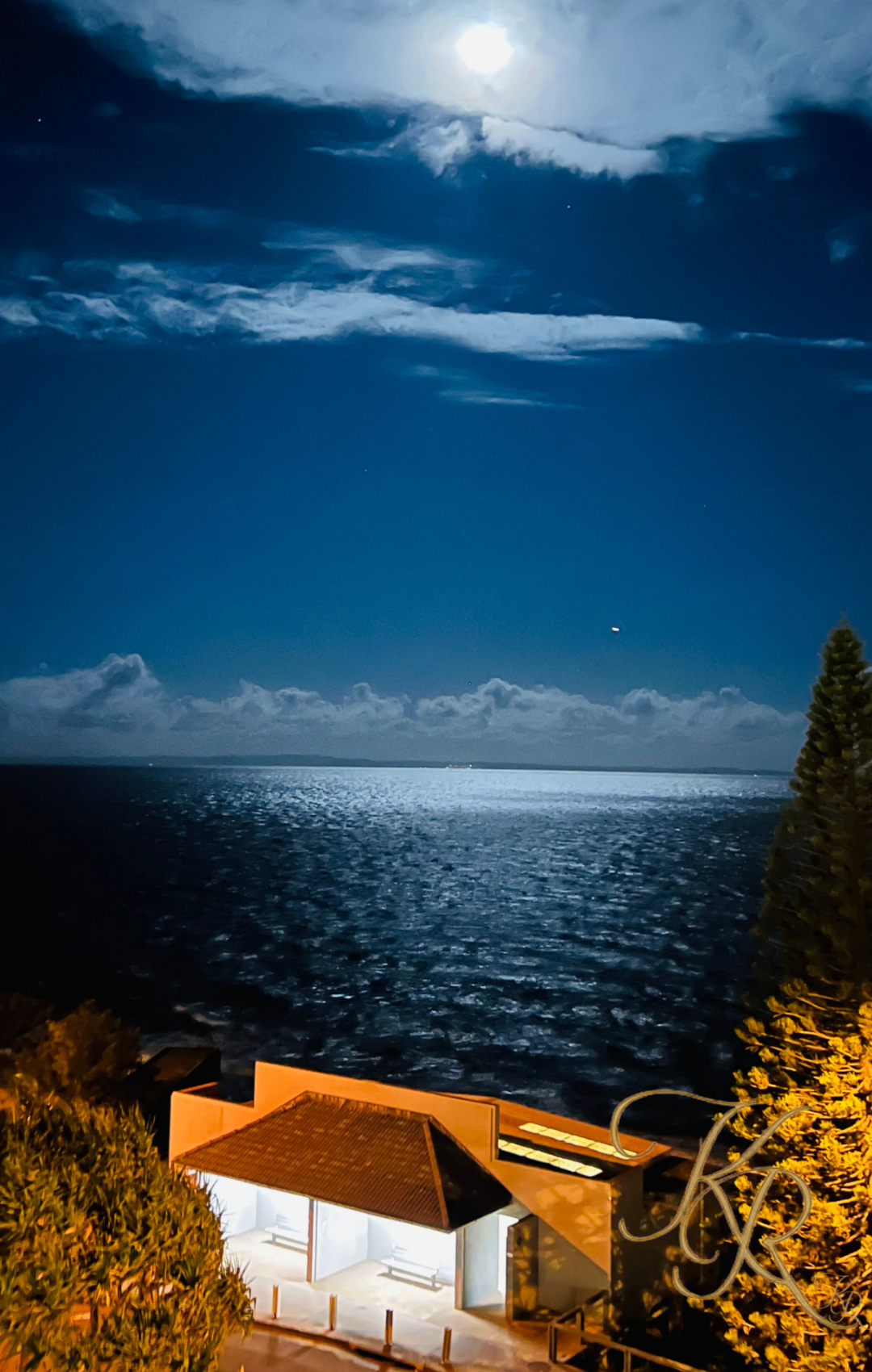 The moonlight spills across the ocean like liquid silver, illuminating everything in its path. The shadows don’t threaten — they frame the glow. This piece invites you to sink into that knowing: