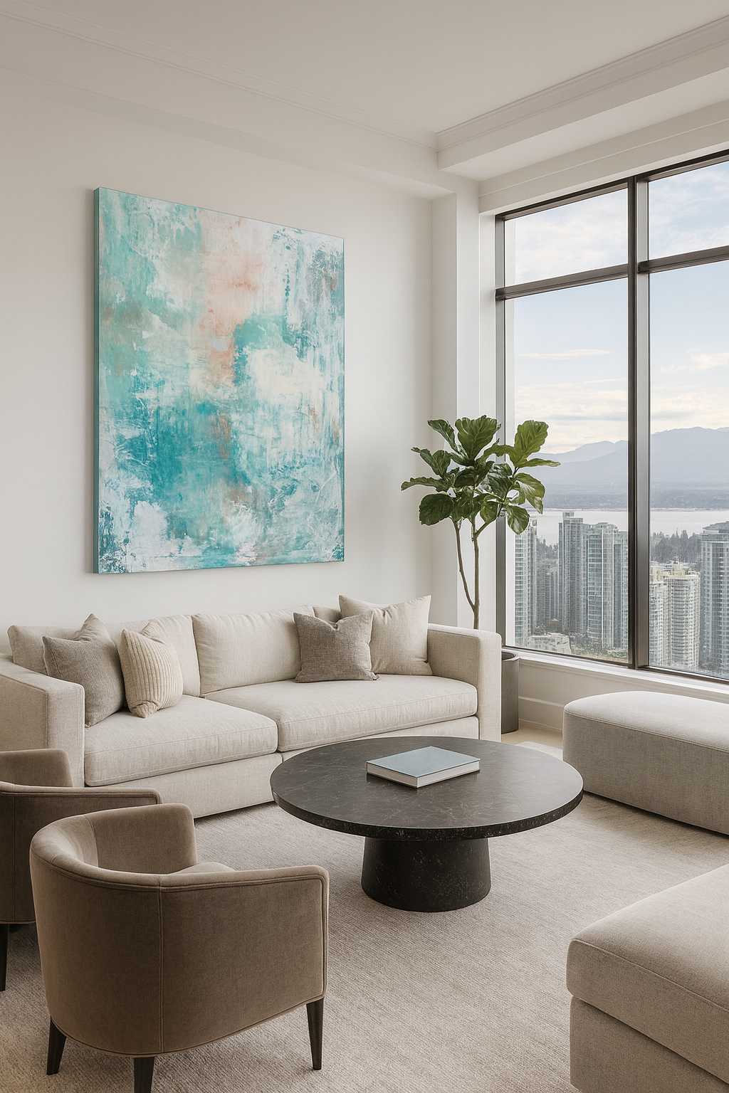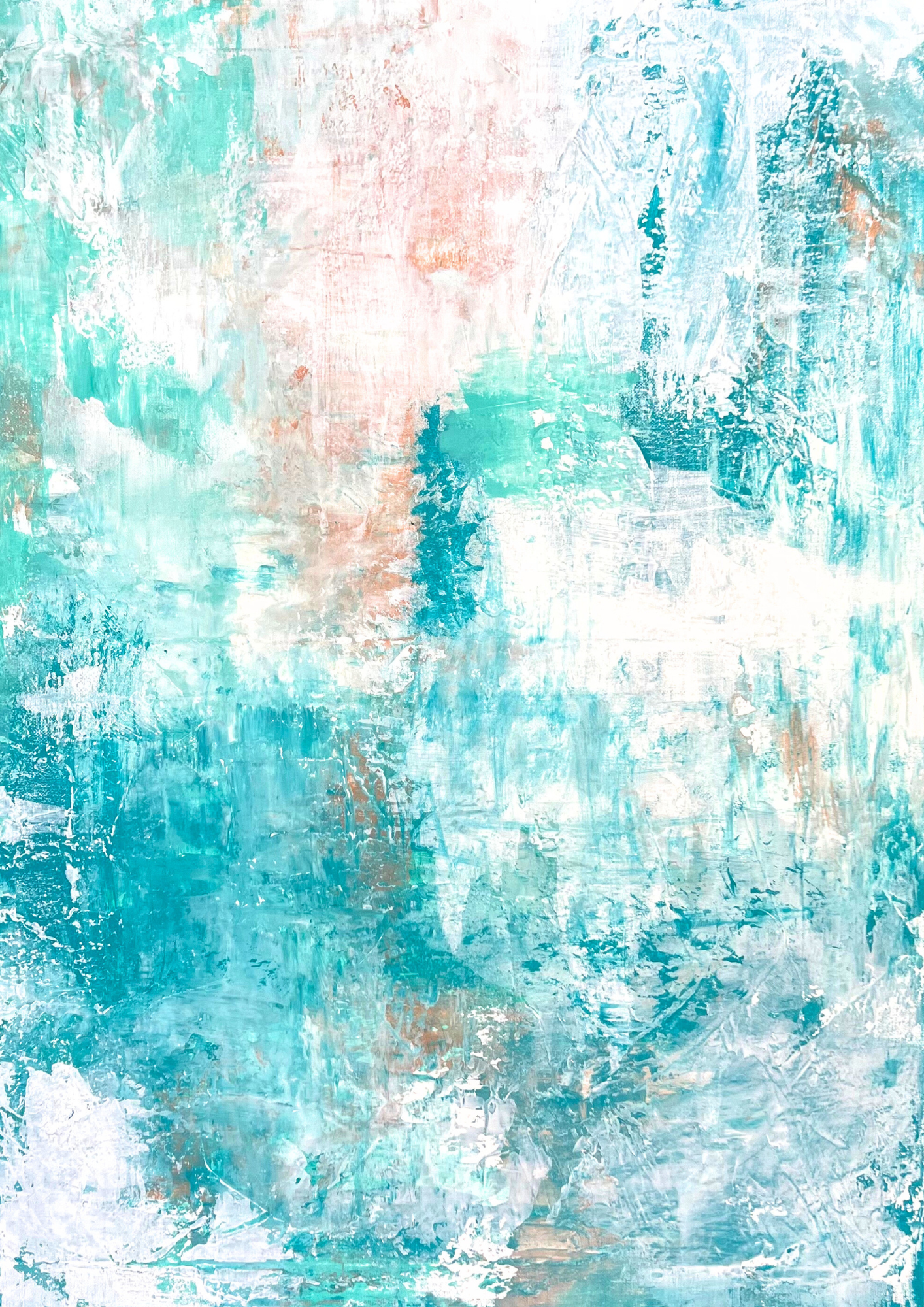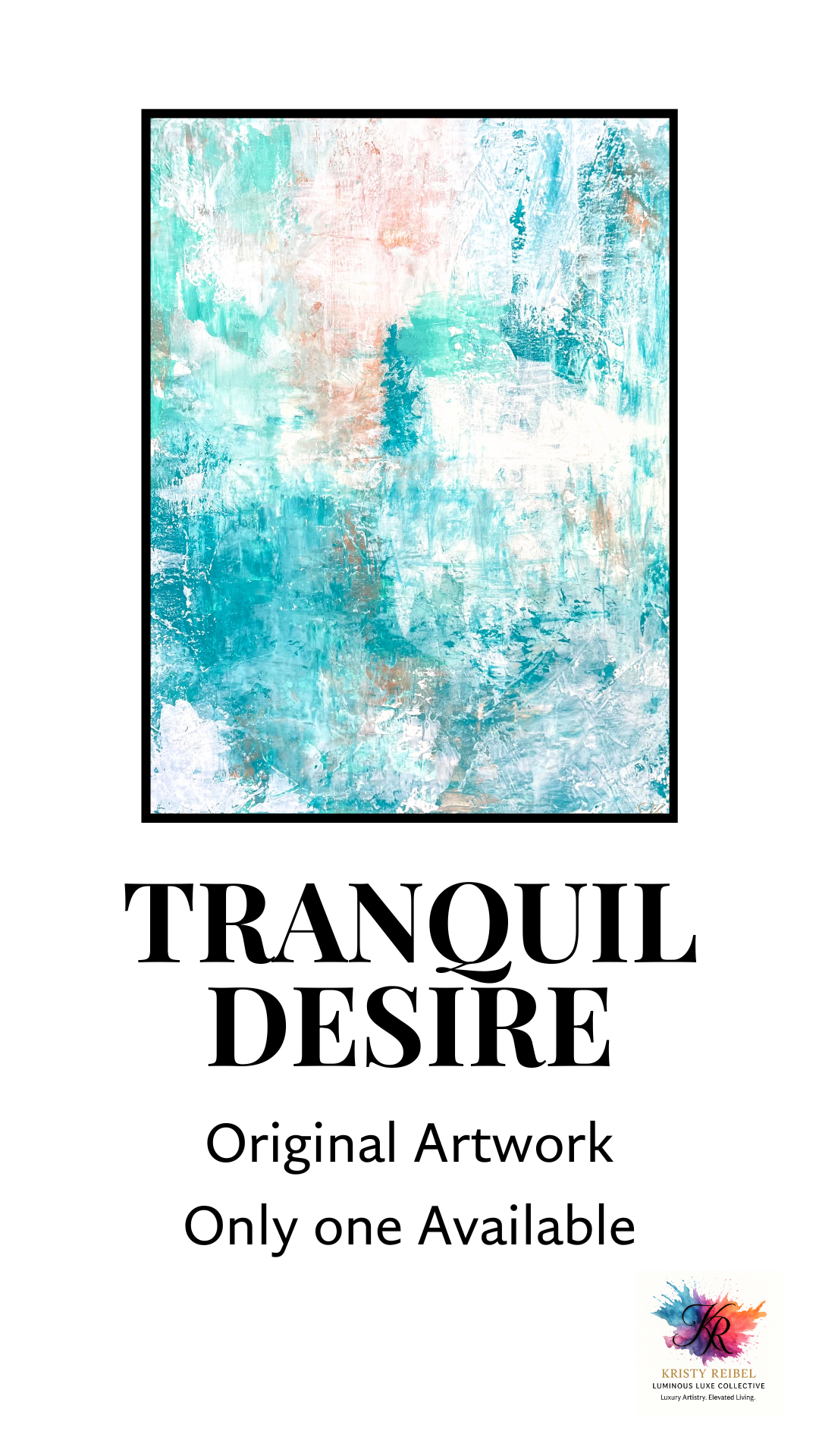 Tranquil Desire invites stillness. Cool tones of aqua, misty white, and soft sand blend in layered textures, creating a peaceful yet captivating composition. It offers the perfect balance between softness and movement, encouraging quiet contemplation.