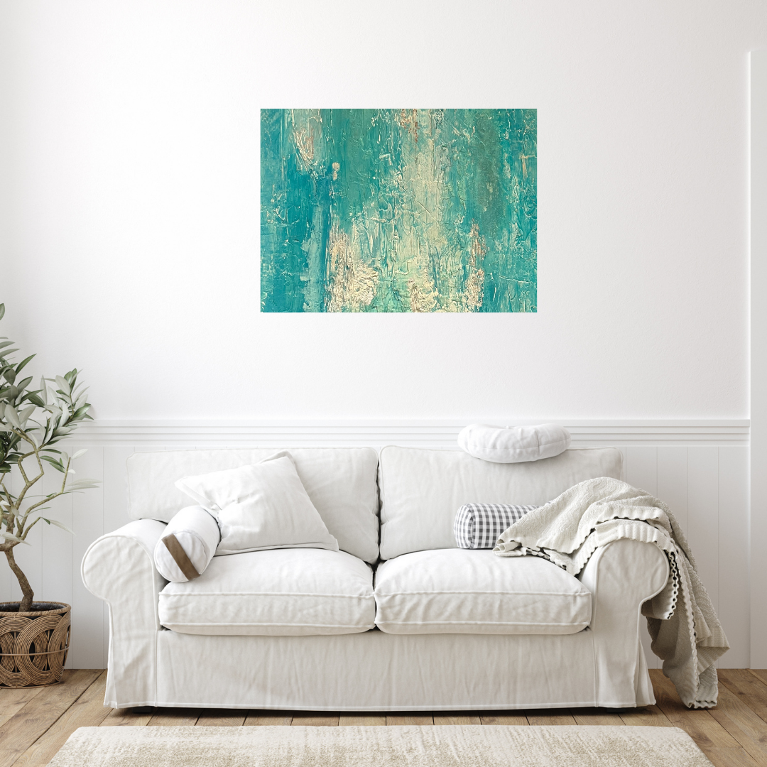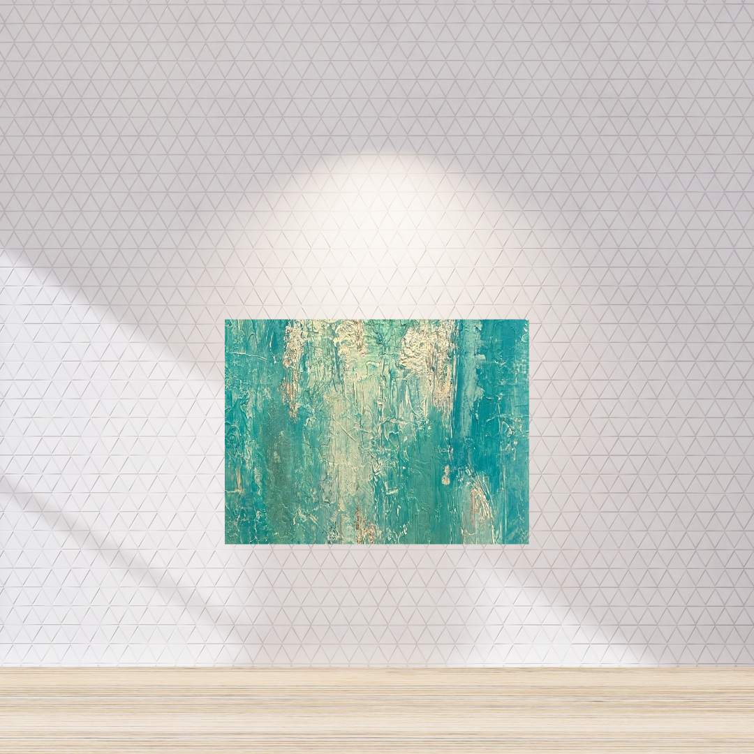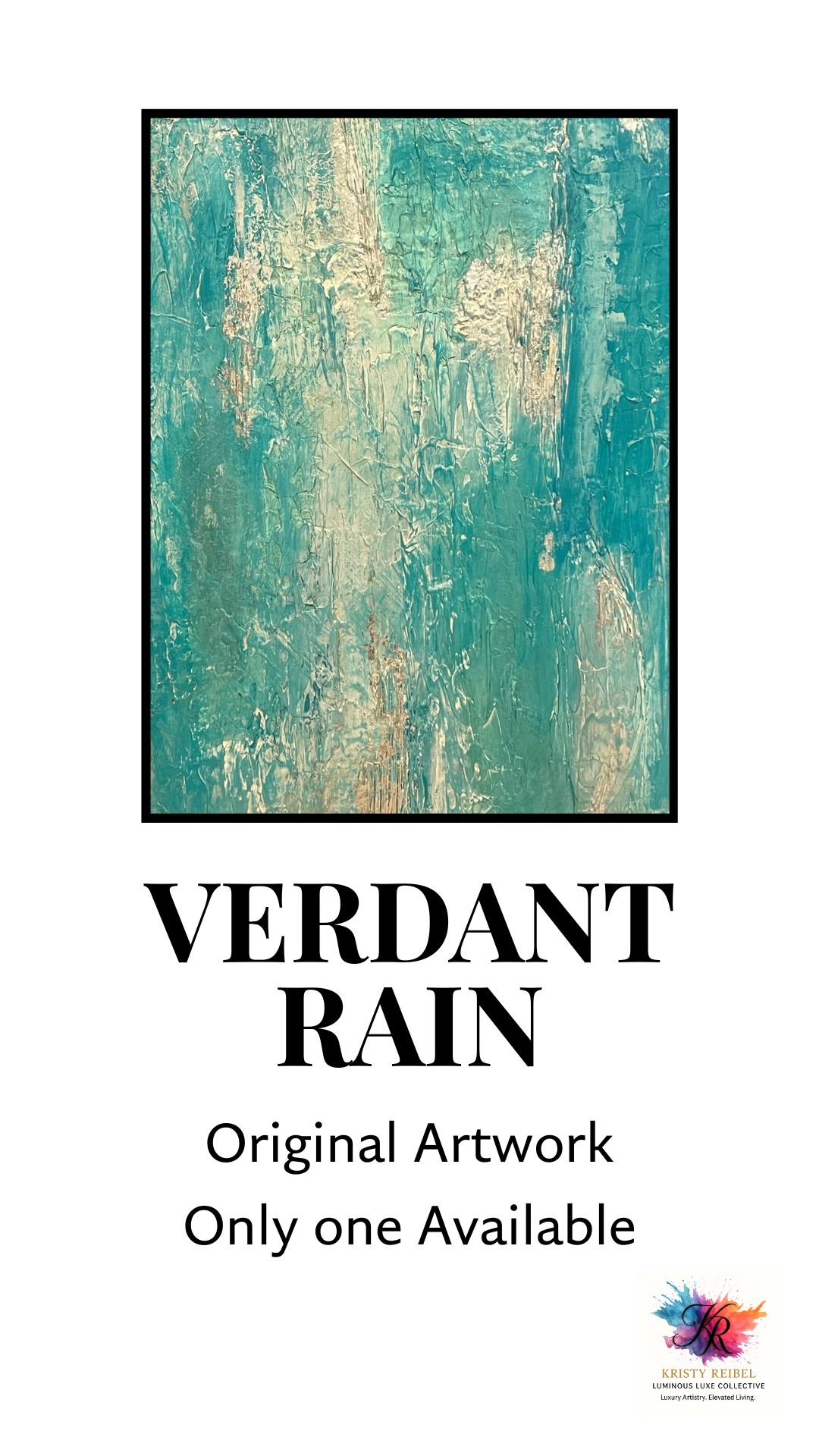 Verdant Rain is a textured original artwork inspired by rain falling through a tropical forest. With layered strokes of jade, mineral aqua, soft sand, and hints of gold-washed green, it captures the essence of renewal — grounded and lush, yet open and free.