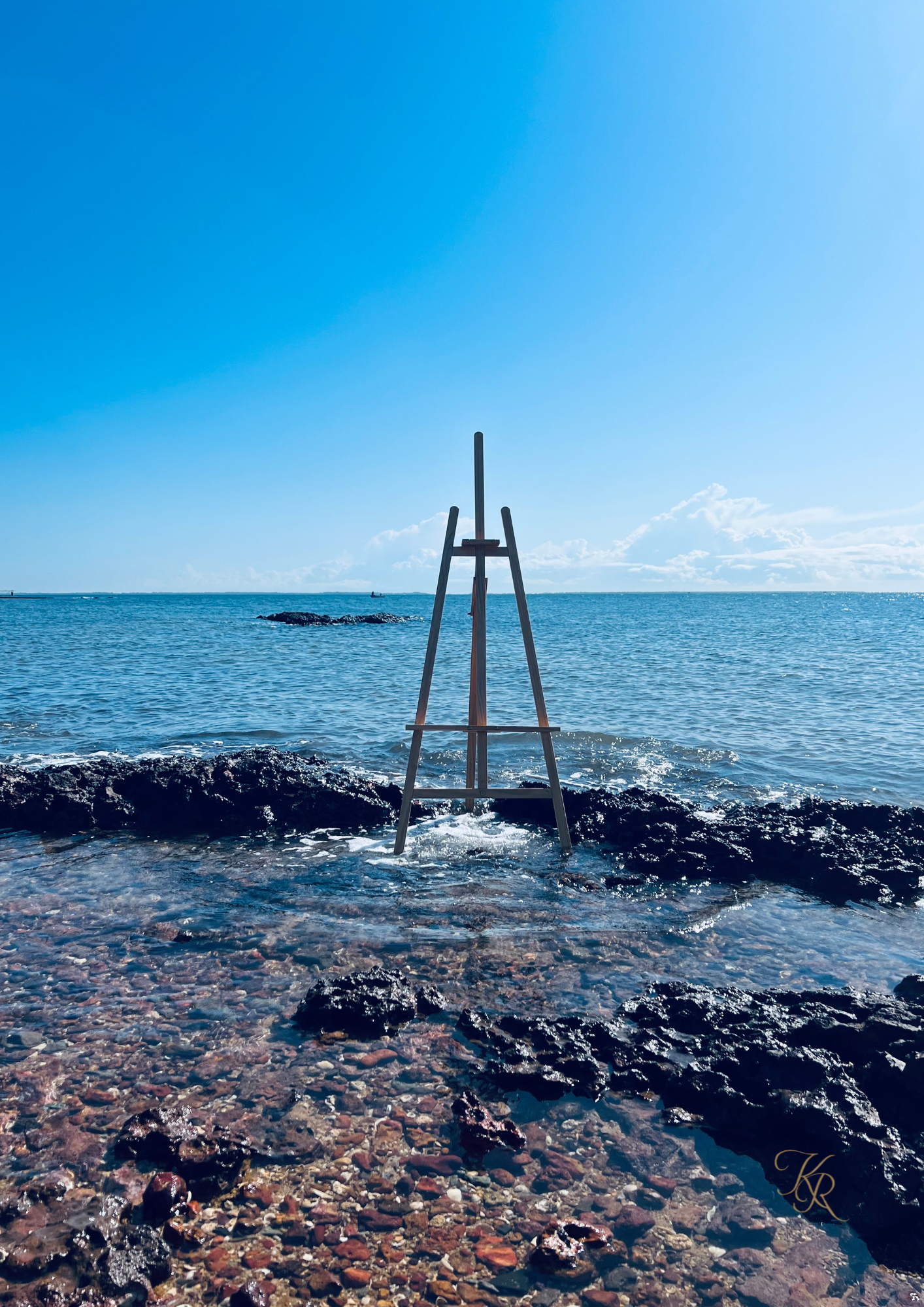 “Where Creation Begins” invites the viewer into the silent electricity of pure potential. Shot in the shallows of a rocky shoreline, this piece captures a wooden easel standing in the tide — a quiet altar of intention surrounded by glistening stones, cool blues, and ancient textures.