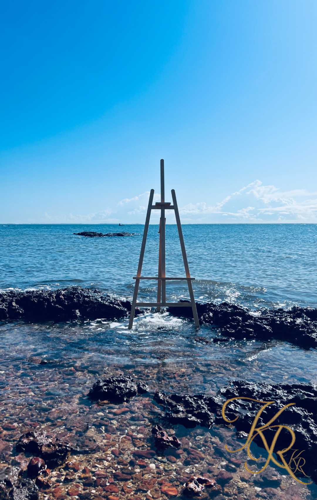 “Where Creation Begins” invites the viewer into the silent electricity of pure potential. Shot in the shallows of a rocky shoreline, this piece captures a wooden easel standing in the tide — a quiet altar of intention surrounded by glistening stones, cool blues, and ancient textures.
