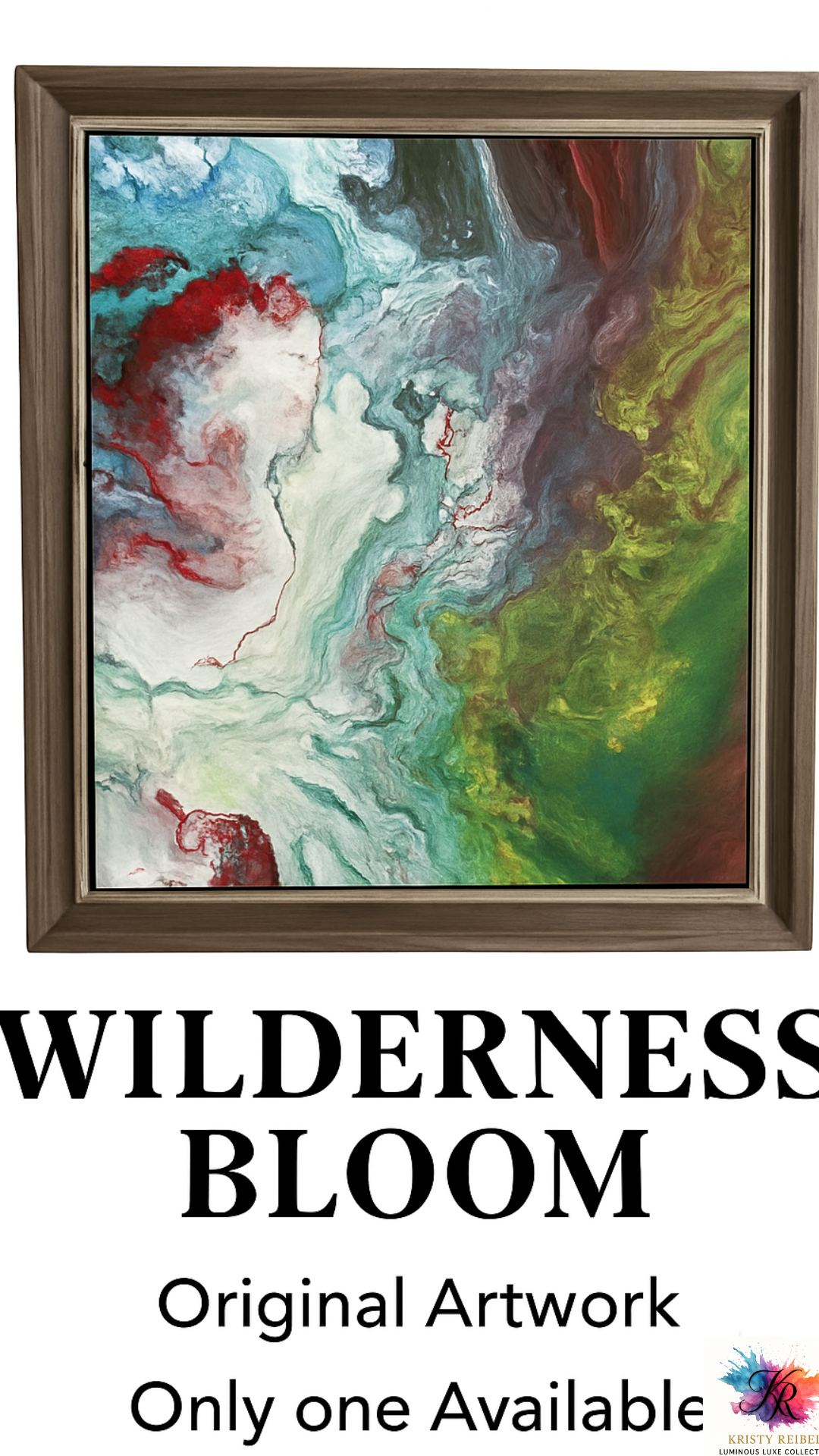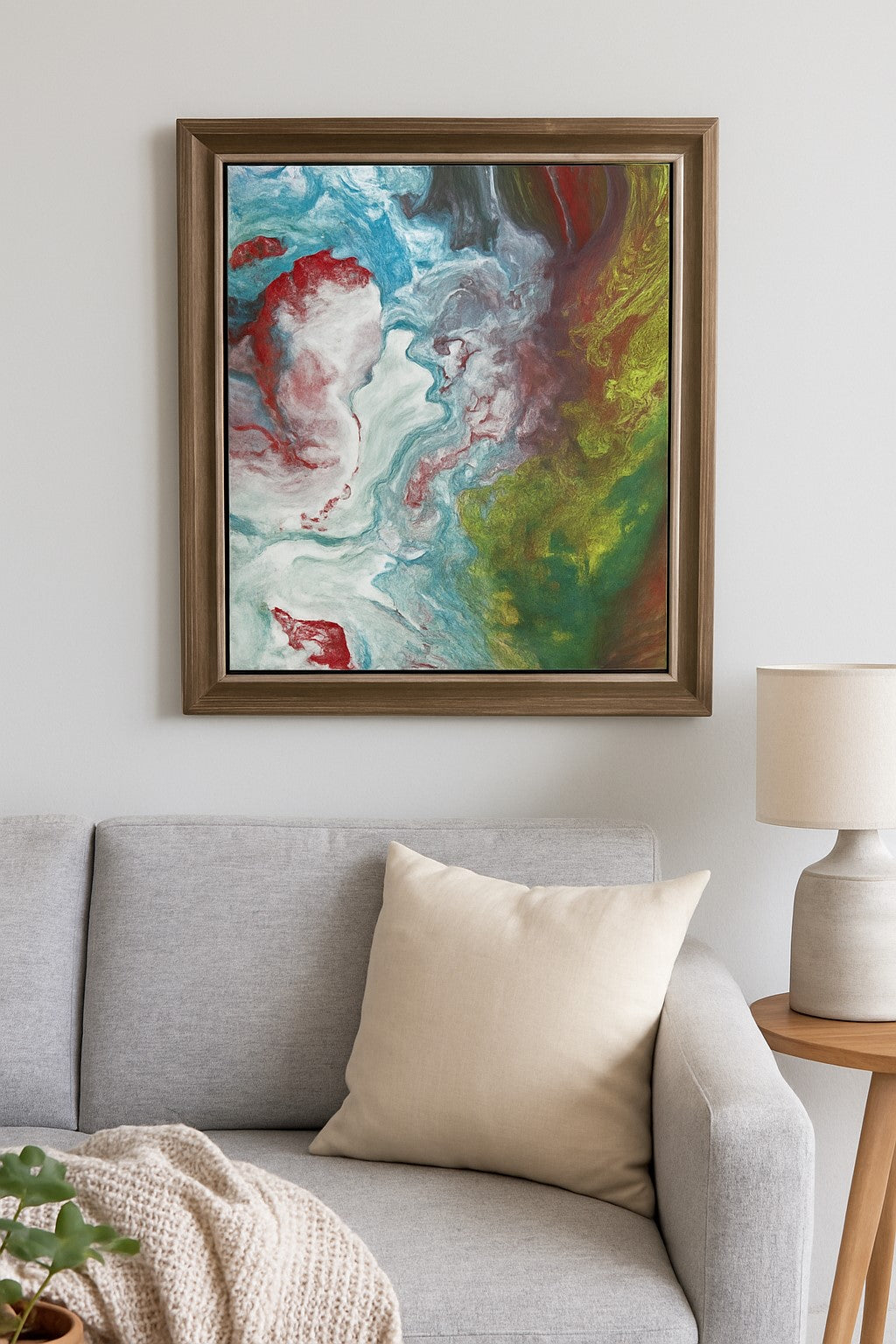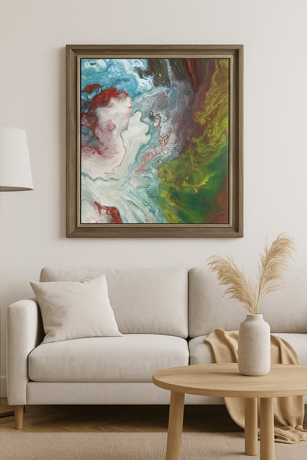 Wilderness Bloom evokes the raw vibrancy of nature unfiltered — like a bloom erupting through earth and sky. With spontaneous layers of teal, moss green, crimson and ivory, this early piece captures the beauty of chaos finding its rhythm. Framed in rustic wood, it brings both colour and curiosity to any space.